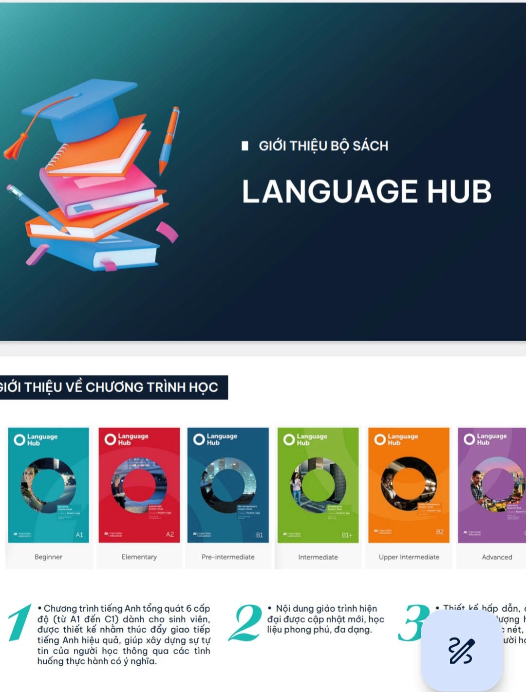 Language Hub là giải pháp công nghệ giáo dục tiếng Anh dành cho các trường Trung cấp, Cao đẳng và Đại học, được thiết kế dựa trên giáo trình American Language Hub của NXB Macmillan Education – Một trong năm nhà xuất bản lớn nhất thế giới. Đây là một bộ giải pháp công nghệ giáo dục toàn diện đầu tiên và duy nhất tại Việt Nam hiện nay giải quyết được trọn vẹn nhu cầu của 4 đối tượng, bao gồm nhà quản lý giáo dục (trường học), giảng viên, sinh viên và phụ huynh. Theo đó, giải pháp công nghệ Language Hub được xây dựng theo mô hình vòng tròn khép kín bao gồm hệ thống quản lý nội dung (CMS), hệ thống quản lý học tập (LMS) để triển khai các hoạt động cho người học và người dạy trên lớp đồng thời kết hợp với ứng dụng web/ app để người học tự ôn luyện, thực hành và làm bài tập tiếng Anh tại nhà.