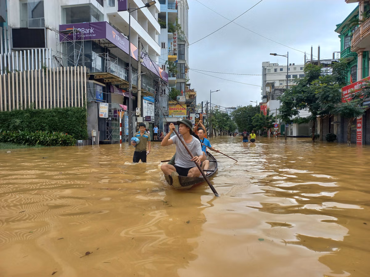 Huế: Đường phố biến thành sông, người dân đi lại bằng ghe thuyền Thứ Bảy 15/10/2022 13:34 (GMT+7) Tính đến 11h trưa ngày 15/10, nhiều tuyến đường thuộc trung tâm thành phố Huế vẫn đang bị nước lũ bủa vây, nhiều phải dùng ghe thuyền để đi lại. Sáng 15/10, tại thành phố Huế (tỉnh Thừa Thiên - Huế) đã ngớt mưa, tuy nhiên nhiều tuyến đường thuộc trung tâm thành phố vẫn bị ngập.Mưa lớn khiến các tuyến đường như Nguyễn Huệ, Hùng Vương, Lý Thường Kiệt, Đống Đa... bị ngập sâu. Nhiều phương tiện đi lại gặp nhiều khó khăn.Người dân phải dùng ghe để đi lại.Một số khác đành đi bộ, lội bì bõm trong nước lũ.Nhiều xe ô tô phải dùng xe cứu hộ để di chuyển qua đoạn đường bị ngập sâu.Các cơ quan công sở, trường học đều bị nước lũ bủa vây.Thống kê từ Văn phòng Ban Chỉ huy PCTT-TKCN tỉnh Thừa Thiên - Huế đến 9h sáng 15/10, do nước sông lên cao và ngập úng bởi cường suất mưa lớn, gây ngập cho nhà cửa ước tính có khoảng 19.918 nhà ngập, với độ sâu từ 0,3-0,8 m tùy từng vùng và khu vực.Tại thành phố Huế, hơn 70% tuyến đường của 36 phường, xã đã bị ngập. Các tuyến đường khu vực Bắc sông Hương (Vạn Xuân, Chi Lăng, Bạch Đằng, Mai Thúc Loan ....) ngập bình quân 0,4-0,6 m; các tuyến đường khu vực Nam sông Hương (Hùng Vương, Trường Chinh, Trần Quang Khải, Bến Nghé, Đống Đa...) ngập bình quân 0,3-0,5 m. Nguyễn Quốc