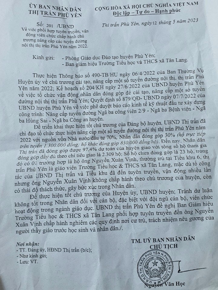 Điều khiến anh V. bức xúc bởi bản thân mình đã công tác trong ngành giáo dục nhiều năm nhưng chỉ vì việc thu tiền này mà UBND thị trấn Phù Yên đã ban hành văn bản gửi Phòng GD&ĐT huyện Phù yên, Ban Giám hiệu Trường Tiểu học và THCS Tân Lang về việc “Phối hợp tuyên truyền, vận động viên chức chấp hành chủ trương nâng cấp các tuyến đường nội thị thị trấn Phù yên năm 2022”.