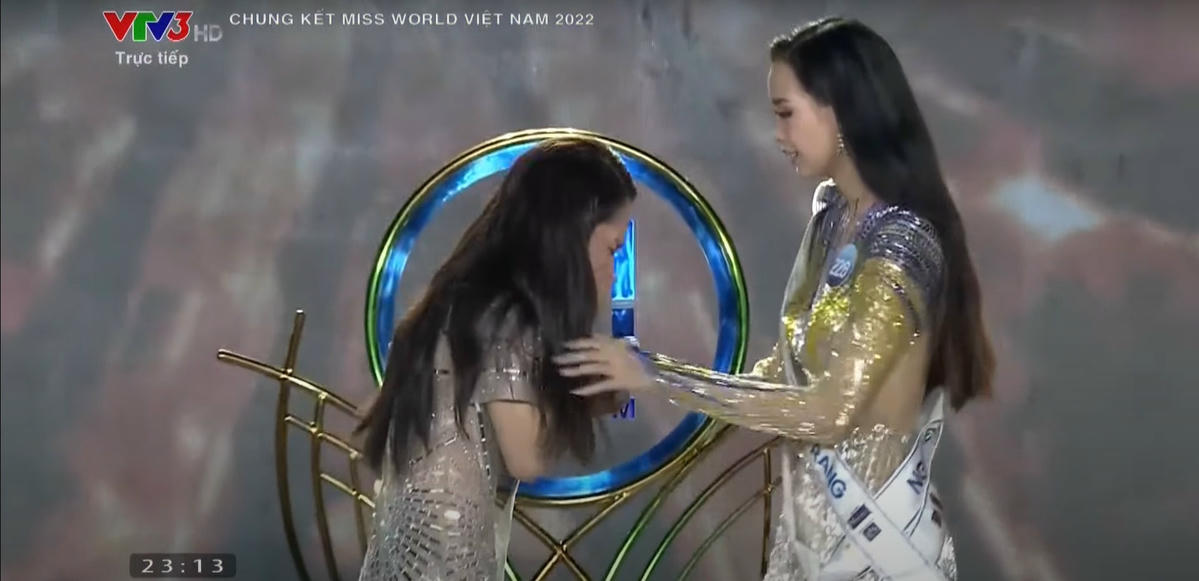 Sau phần trả lời của Bảo Ngọc, bà Phạm Kim Dung gọi tên Tân Hoa hậu Miss World Vietnam 2022 là Huỳnh Nguyễn Mai Phương. Danh hiệu Á hậu 1 thuộc về Bảo Ngọc.