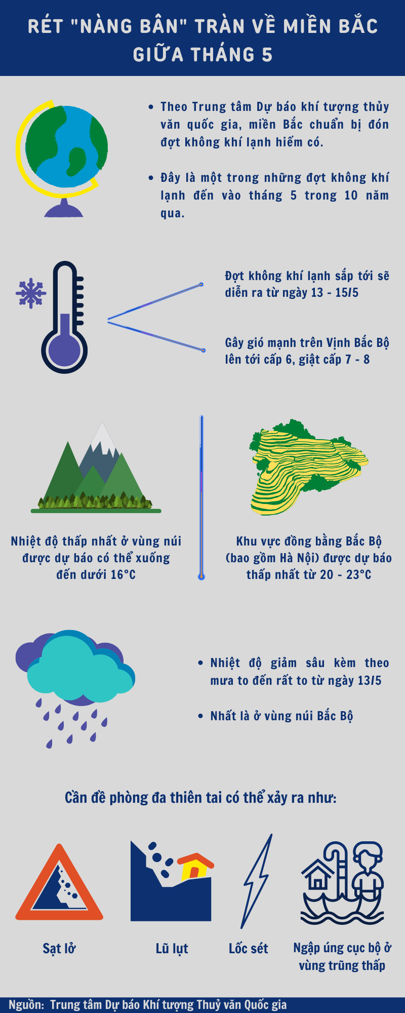 Theo cơ quan khí tượng, đợt rét giữa tháng 5 là một trong những đợt không khí lạnh hiếm gặp. Trong khoảng 40 năm qua, theo số liệu quan trắc ở trạm Láng (Hà Nội) vào ngày 4/5/1981, nhiệt độ trung bình ngày ghi nhận là 19,6 độ.