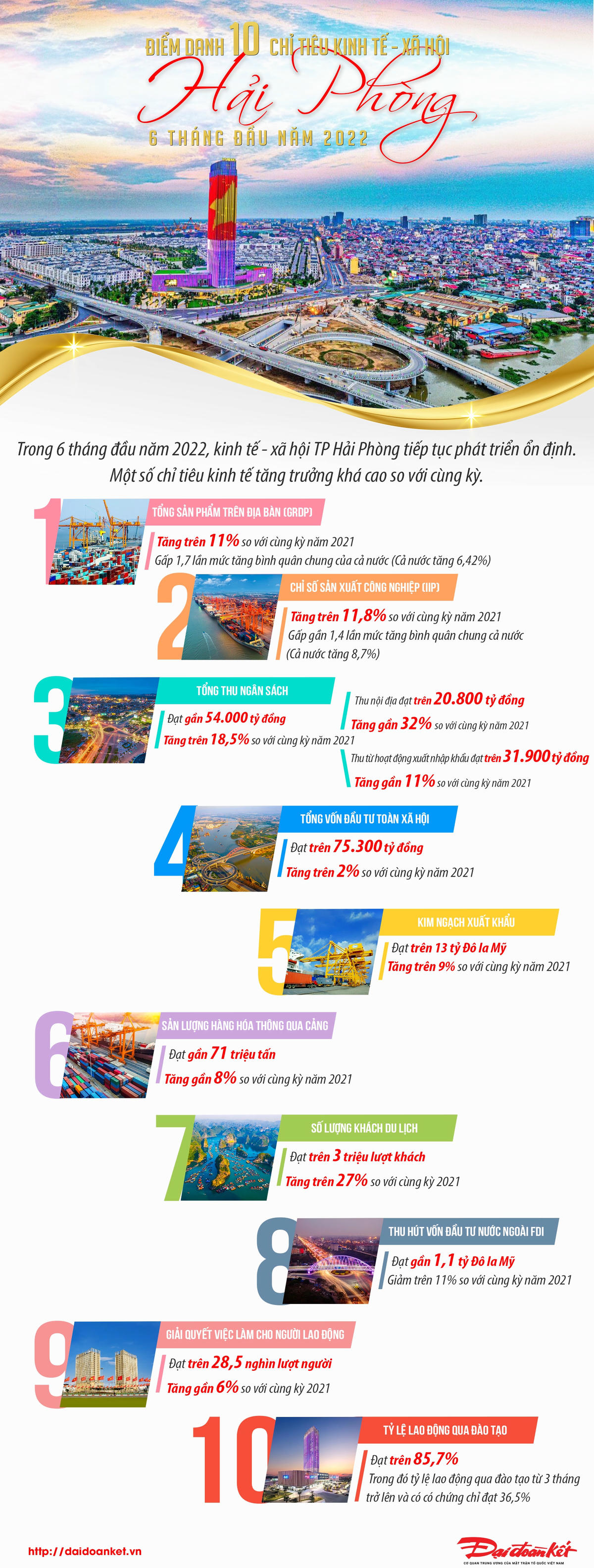 [Infographic] Điểm 10 chỉ tiêu KTXH của Hải Phòng trong 6 tháng đầu năm 2022 Thứ Sáu 01/07/2022 14:04 (GMT+7) Trong 6 tháng đầu năm 2022, kinh tế - xã hội TP Hải Phòng tiếp tục phát triển ổn định. Một số chỉ tiêu kinh tế tăng trưởng khá cao so với cùng kỳ. Ngọc Anh