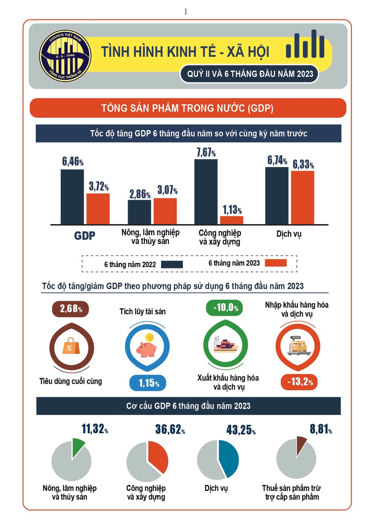 Nhìn chung, kinh tế - xã hội nước ta trong 6 tháng đầu năm 2023 đã đạt được những kết quả tích cực, kinh tế vĩ mô ổn định, các cân đối lớn được đảm bảo, lạm phát được kiểm soát ở mức phù hợp. Kết quả đạt được của cả nước, các ngành, lĩnh vực và địa phương trong quý II và 6 tháng đầu năm 2023 như sau: