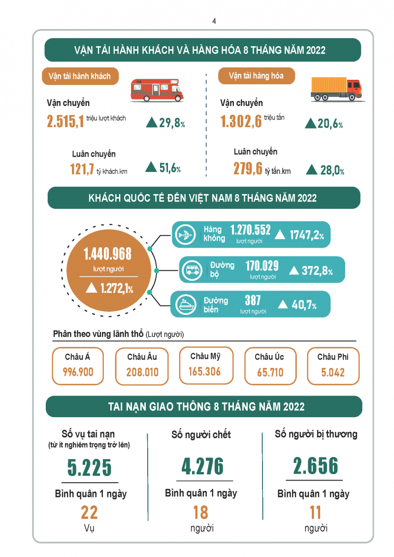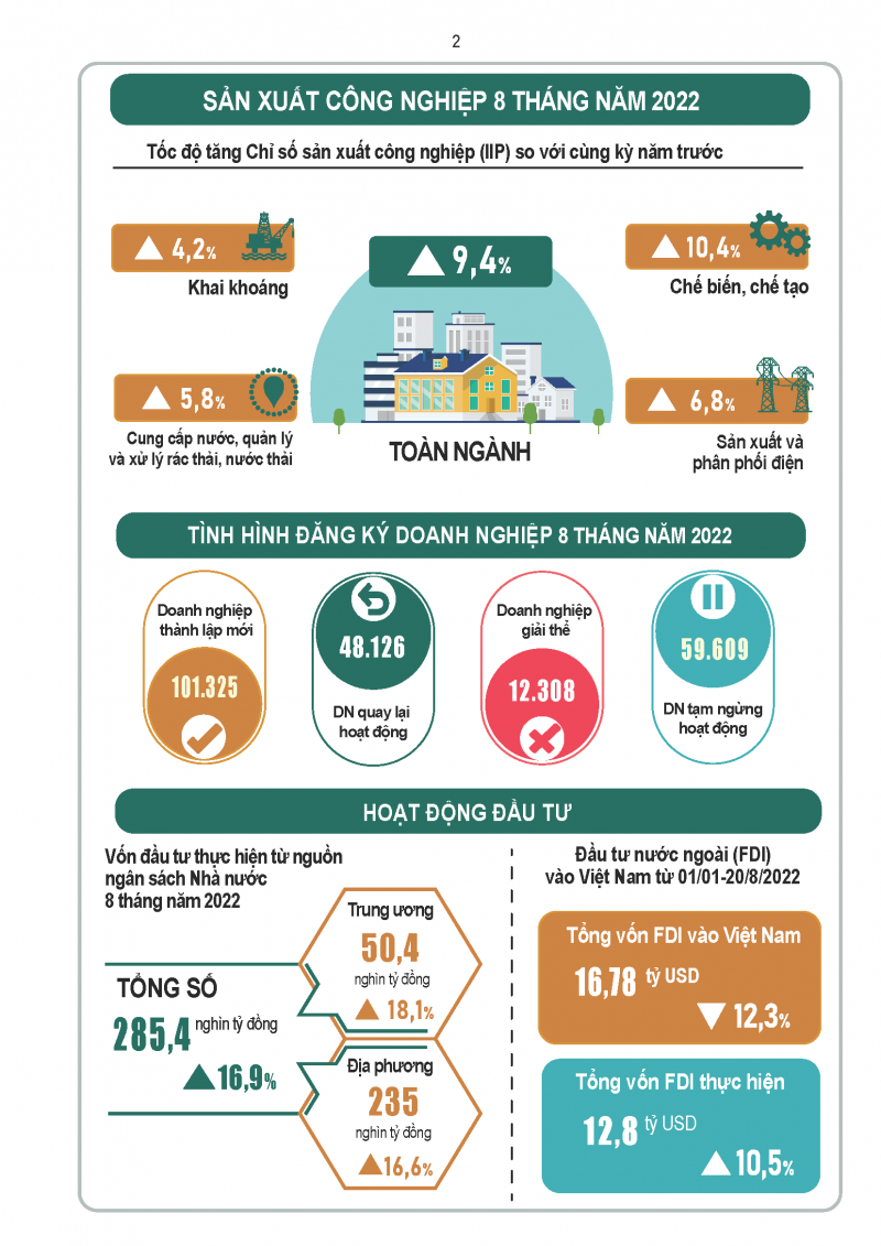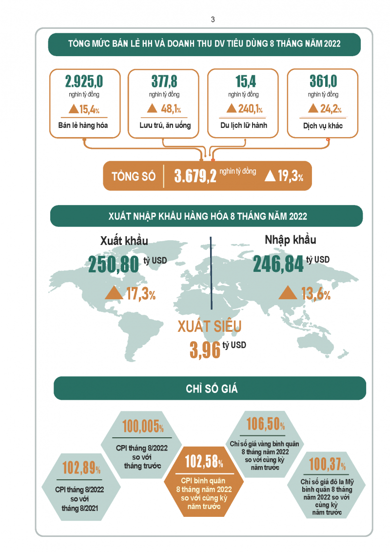 Dữ liệu và số liệu thống kê về tình hình kinh tế - xã hội tháng 8 và 8 tháng năm 2022.