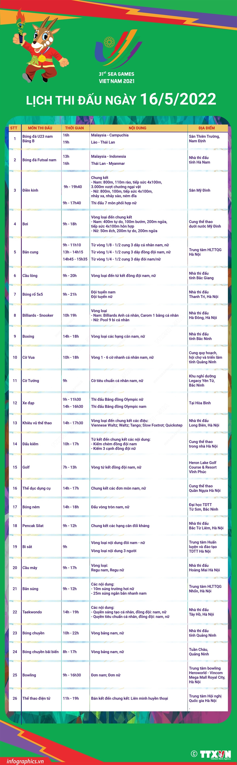 [Infographics] Lịch thi đấu các bộ môn tại SEA Games 31 ngày 16/5