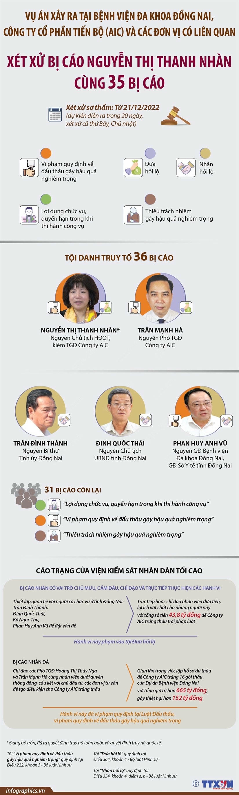 Ngày 21/12/2022, Tòa án nhân dân thành phố Hà Nội mở phiên tòa xét xử sơ thẩm bị cáo Nguyễn Thị Thanh Nhàn (Chủ tịch HĐQT kiêm Tổng giám đốc Công ty cổ phần Tiến bộ - viết tắt là Công ty AIC) và 35 bị cáo trong vụ án xảy ra tại Bệnh viện Đa khoa Đồng Nai, Công ty AIC và các đơn vị có liên quan.