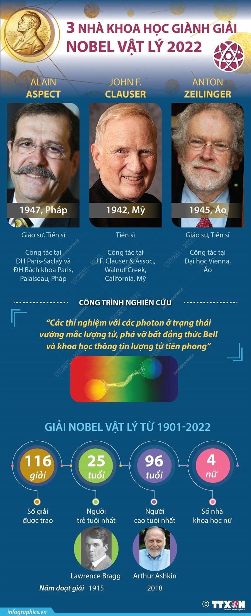 Chiều 4/10 (giờ Việt Nam), Viện Hàn lâm Khoa học Hoàng gia Thụy Điển công bố Giải Nobel Vật lý năm 2022 trao cho ba nhà khoa học: Alain Aspect (Pháp), John F. Clauser (Mỹ) và Anton Zeilinger (Áo) về “các thí nghiệm với các photon ở trạng thái vướng mắc lượng tử, phá vỡ bất đẳng thức Bell và khoa học thông tin lượng tử tiên phong”.