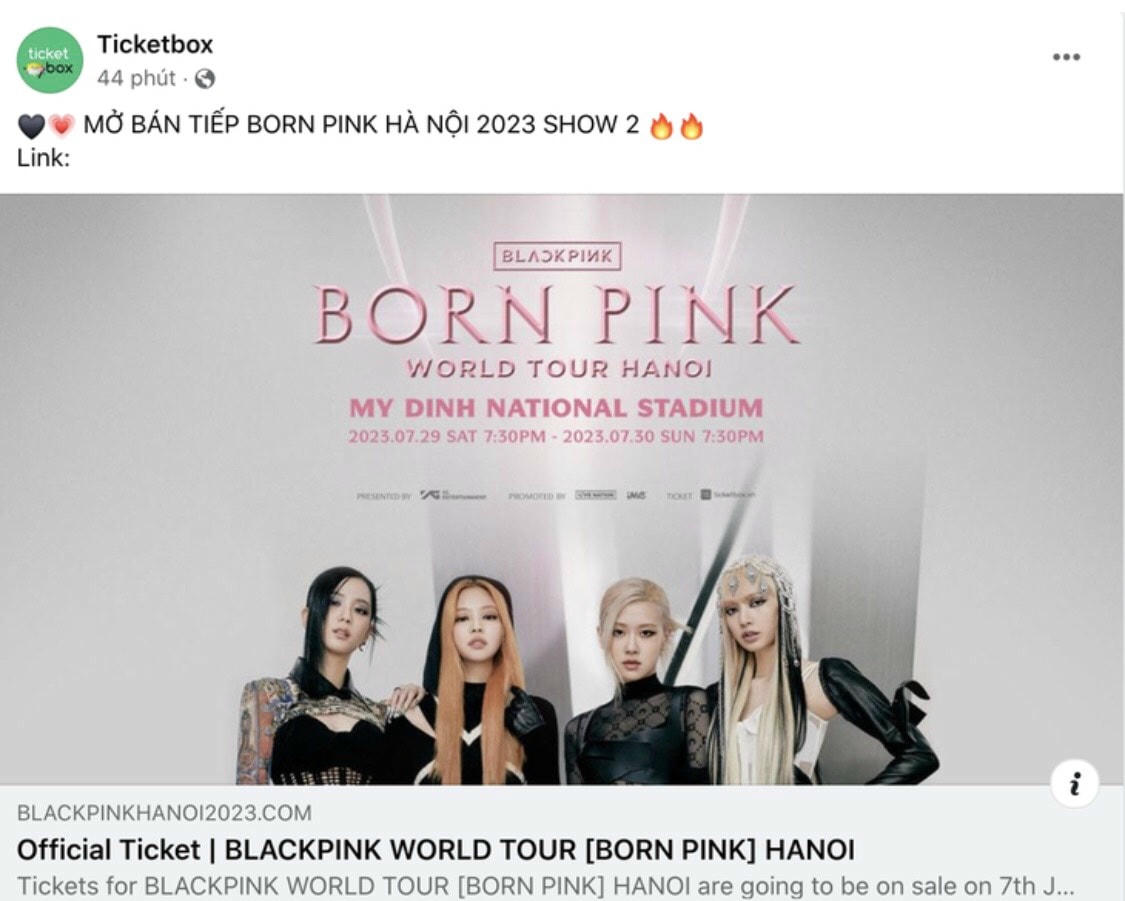 Theo đó, cách đây 1 tiếng, trang Instagram chính thức của nhóm nhạc Black Pink bất ngờ dẫn đường link đến Ticketbox và cho biết vé sẽ được phát hành thêm cho đêm cuối cùng của Born Pink tại Hà Nội.