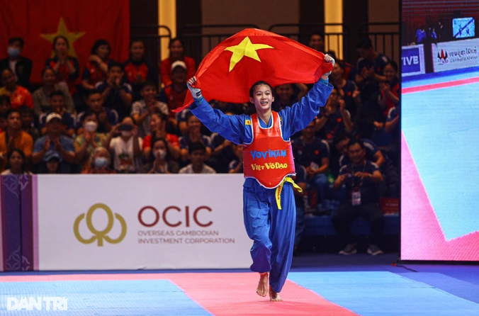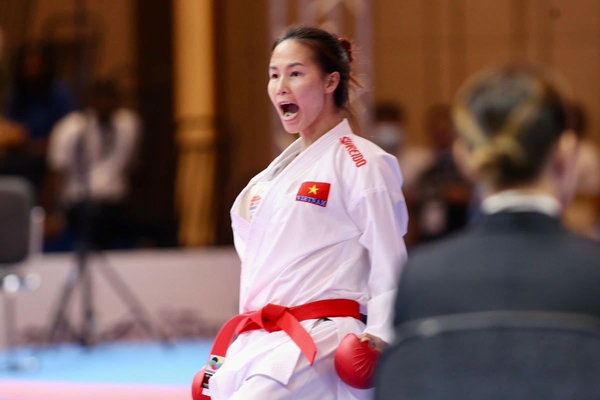 Võ sĩ Hoàng Thị Mỹ Tâm đánh bại đối thủ Indonesia ở chung kết để giành HCV thứ hai cho karate Việt Nam tại SEA Games 32.