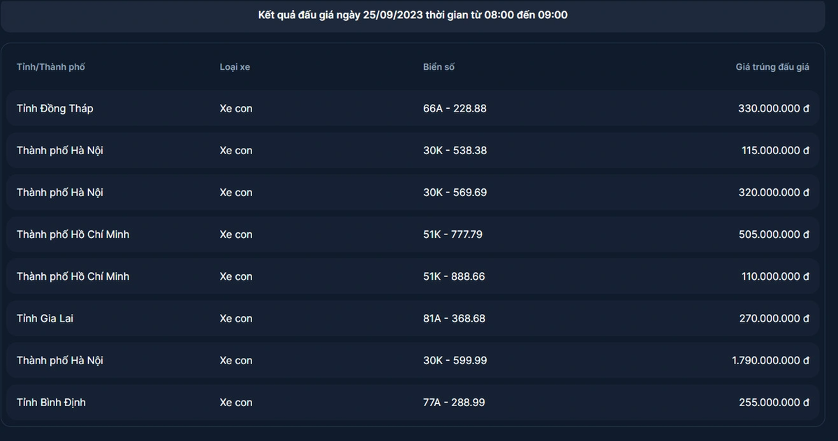 Trước đó, khi kết thúc các phiên đấu giá trong các ngày 15/9, 21/9 và 22/9, một số người trúng đấu giá đã hoàn thành nghĩa vụ tài chính như biển số: Bắc Ninh 99A-666.66 (mức giá trúng đấu giá là 4,27 tỷ đồng); Đà Nẵng 43A-799.99 (mức giá trúng đấu giá là 1,16 tỷ đồng); Hải Phòng 15K-188.88 (giá trúng đấu giá là 650 triệu đồng).