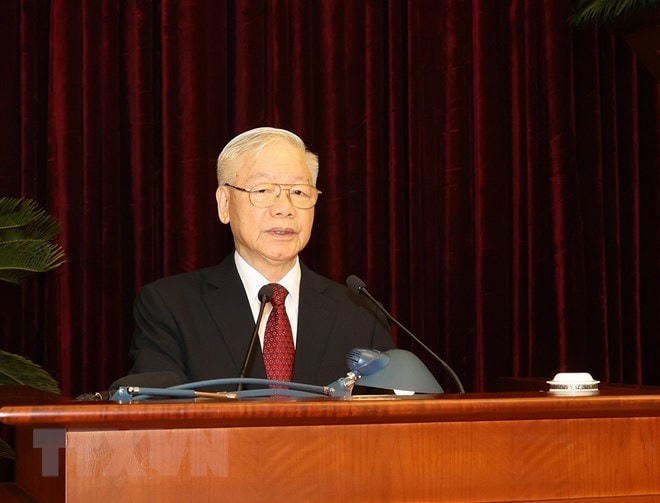 Tổng Bí thư Nguyễn Phú Trọng chủ trì và phát biểu khai mạc Hội nghị lần thứ sáu Ban Chấp hành Trung ương Đảng Cộng sản Việt Nam khóa XIII. Ảnh: Trí Dũng/TTXVN.