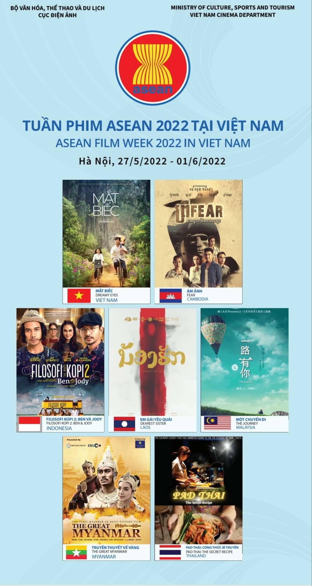 Tuần phim ASEAN 2022 tại Việt Nam do Bộ VHTTDL chủ trì, phối hợp với các thành phố Hà Nội, Thành phố Hồ Chí Minh và các cơ quan liên quan tổ chức từ ngày 27/5 đến ngày 1/6 tại Thủ đô Hà Nội và từ 28/5 đến hết ngày 2/6 tại Thành phố Hồ Chí Minh.