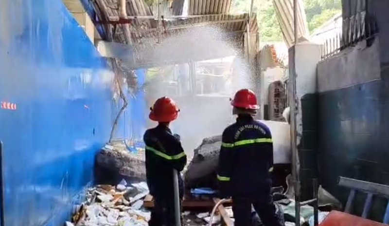 Nhận được thông tin vụ nổ, Phòng Cảnh sát PCCC và CNCH Công an tỉnh Khánh Hòa cùng Công an TP.Nha Trang điều động các cán bộ, chiến sĩ lên hai xe chuyên dụng chữa cháy khẩn trương đến hiện trường triển khai đội hình phun nước.