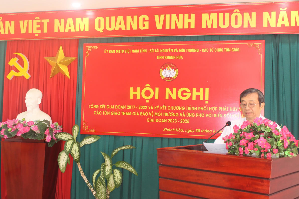 Ngày 30/6, Ủy ban MTTQ Việt Nam tỉnh Khánh Hòa, đã tổ chức hội nghị tổng kết và ký kết chương trình phối hợp với Sở Tài nguyên và Môi trường, các tổ chức tôn giáo trên địa bàn về “Phát huy vai trò các tôn giáo tham gia bảo vệ môi trường và ứng phó với biến đổi khí hậu” giai đoạn 2023-2026.