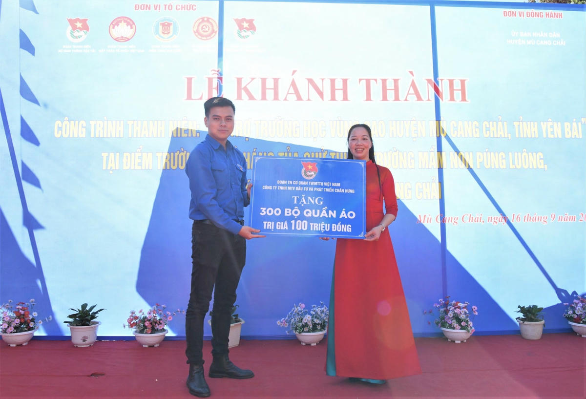 Tại buổi lễ, Đoàn Thanh niên UBTƯ MTTQ Việt Nam và Công ty TNHH MTV đầu tư và phát triển Chấn Hưng đã trao tặng 300 bộ quần áo (trị giá 100 triệu đồng) cho các cháu học sinh.