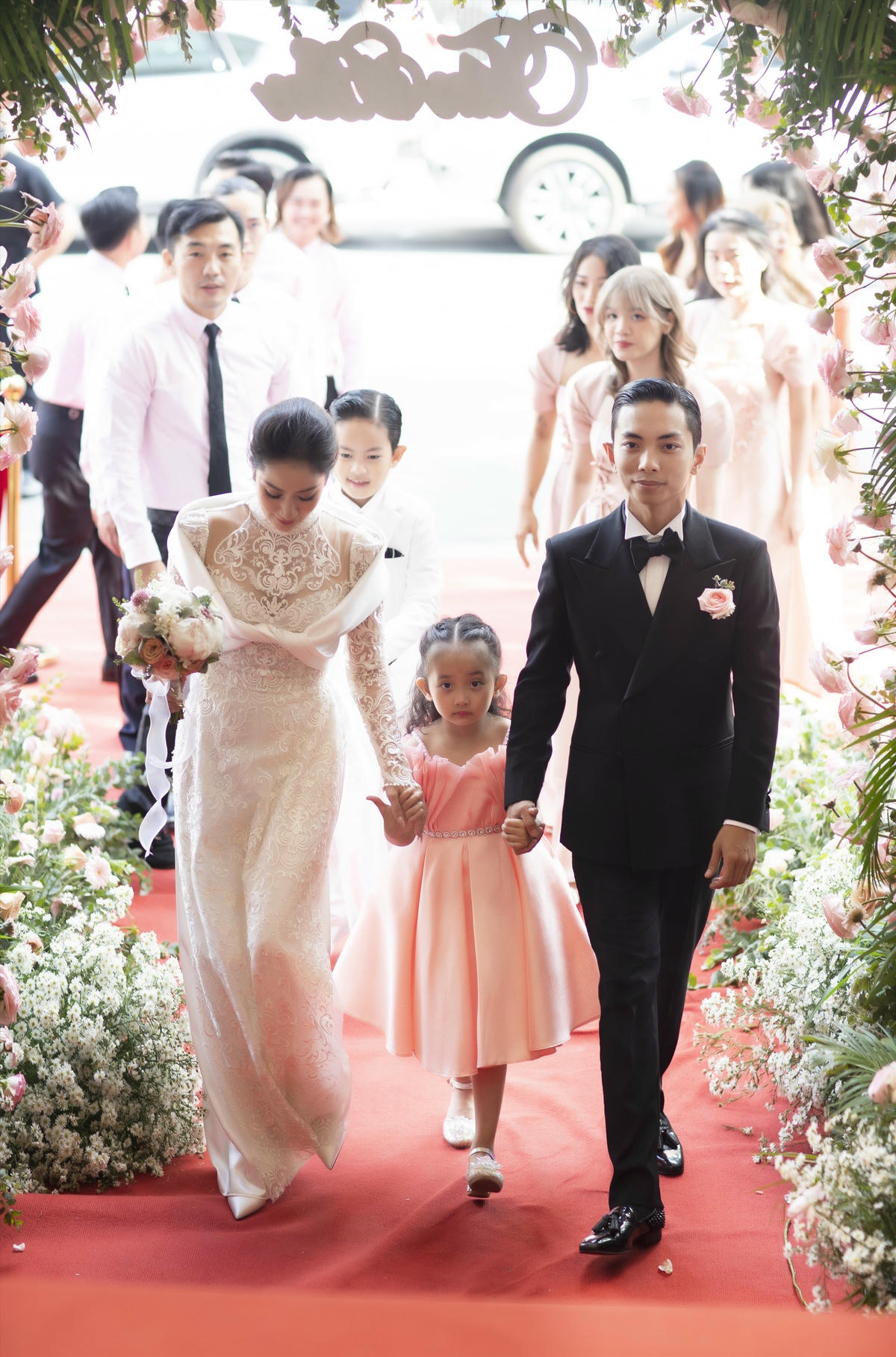 Đúng 9h30, cô dâu và chú rể xuất hiện với gương mặt rạng ngời hạnh phúc. Ảnh: MXH. Dàn phù dâu đều là học trò củaKhánh Thi. Trong hôn lễ Khánh Thi yêu kiều với chiếc áo dài cưới được thiết kế sang trọng của nhà thiết kế Anh Thư. Đây là món quà mà Anh Thư đã gửi tặng cho người bạn thân trong ngày trọng đại. Ảnh: MXH.Khánh Thi về sống chung với Phan Hiển và gia đình anh từ khi sinh bé Kubi. Nhiều năm qua, hai người nhiều lần dự định tổ chức đám cưới nhưng không thành. Ảnh: MXH. Sau khi trao nhẫn cưới cho cô dâu, Phan Hiển tình tứ bày tỏ tình cảm với vợ trong lễ đường, trước sự chứng kiến của gia đình. Ảnh: MXH. Trong buổi lễ, Khánh Thi bật khóc khi bà ngoại Phan Hiển tuyên bố cháu dâu đã có danh phận.Ảnh: MXH. Khánh Thi nhiều lần không kìm được nước mắt, khóc nấc lên thành tiếng trong hôn lễ của mình và Phan Hiển. Ảnh: MXH. Chuyện tình từng vấp phải nhiều ý kiến nhưng với họ, mỗi ngày đều là ngày hạnh phúc. Hôn lễ cũng chính là minh chứng cho tình yêu bền chặt của 2 người. Ảnh: MXH.Khánh Thi nói trong hôn lễ: "Thực sự, em không tin đây là sự thật. Được sống với anh và gia đình anh với em đã là hạnh phúc lắm rồi. Hôm nay lại được anh rước về làm dâu và được mặc áo cưới nữa. Em yêu anh". Ảnh: MXH.