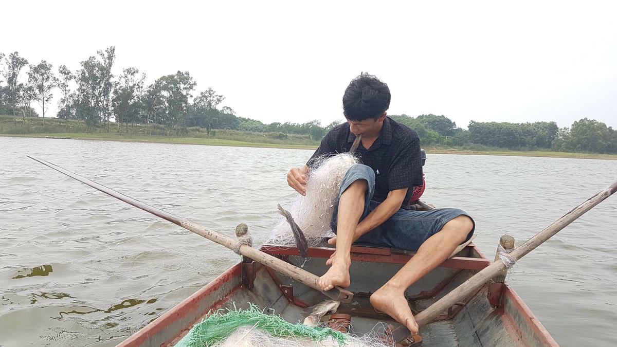 Nghe thấy tiếng gọi của ông Tưởng, anh Trang con trai ông cố thả hết tấm lưới đang buông dở rồi quay thuyền vào bờ đón chúng tôi. Đợi mọi người yên vị trên chiếc thuyền, anh hồ hởi khoe với bố, có bác Nguyễn Văn Vĩnh cũng đến thăm từ sáng.
