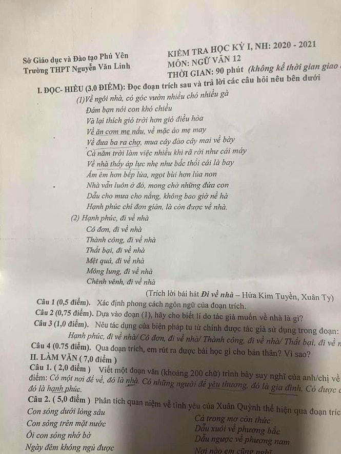 Theo đó, trên mạng xã hội những ngày vừa qua lan truyền một hình ảnh về đề thi cuối học kì 1 (2020 - 2021) của học sinh lớp 12, trường THPT Nguyễn Văn Linh (TX Đông Hòa, tỉnh Phú Yên) đã sử dụng một đoạn trong lời bài hát Đi về nhà - Đen Vâu ft. JustaTee để đặt câu hỏi trong phần đọc hiểu (3 điểm).