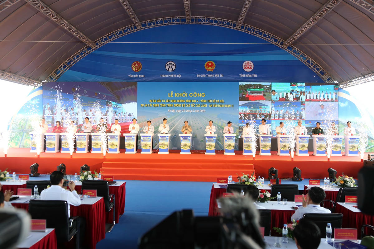 Sáng nay (25/6), Dự án đường Vành đai 4 - Vùng Thủ đô Hà Nội, công trình trọng điểm quốc gia chính thức được khởi công tại 4 vị trí trên địa bàn thành phố Hà Nội và 2 tỉnh Hưng Yên, Bắc Ninh.