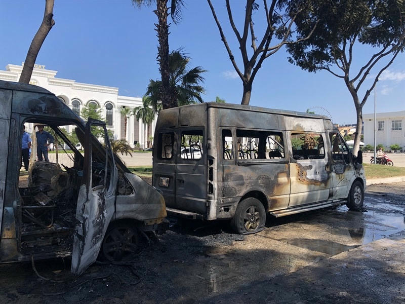 Hai xe ô tô 16 chỗ biển kiểm soát 92 màu vàng (xe tư nhân ở tỉnh Quảng Nam làm dịch vụ) chờ khách trước dãy nhà hàng tiệc cưới ở đường 2 tháng 9 (Đà Nẵng) bị lửa thiêu rụi vào lúc 13h trưa nay 4/9.