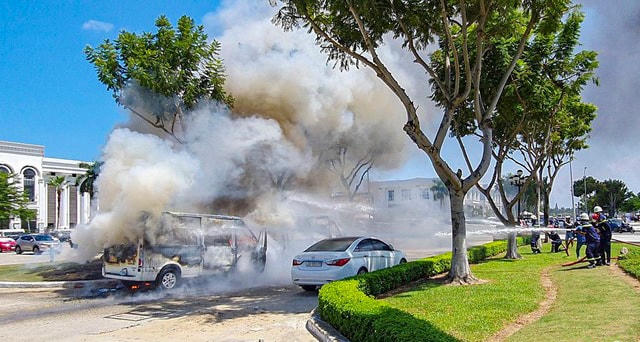 Theo các nhân chứng, khi lưu thông trên đường 2 tháng 9 vào thời điểm nói trên, họ thấy lửa và khói bốc lên từ chiếc xe 16 chỗ BKS 92 đậu trong bãi giữ xe trước dãy nhà hàng tiệc cưới. Chỉ ít phút, lửa lan sang chiếc xe 16 chỗ (cùng BKS 92 màu vàng) đậu phía trước làm xe này bùng cháy dữ dội.
