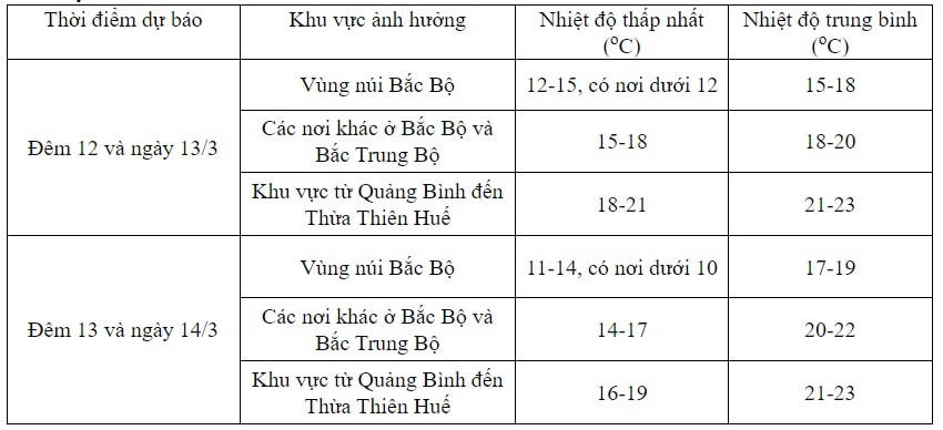 Ngày 13/3, ở Bắc Bộ và Bắc Trung Bộ trời rét; khu vực từ Quảng Bình đến Thừa Thiên Huế trời chuyển rét. Trong đợt không khí lạnh này, nhiệt độ thấp nhất ở Bắc Bộ và Bắc Trung Bộ phổ biến 14-17 độ, khu vực vùng núi Bắc Bộ phổ biến 11-14 độ, vùng núi cao có nơi dưới 10 độ; khu vực từ Quảng Bình đến Thừa Thiên Huế phổ biến 16-19 độ.