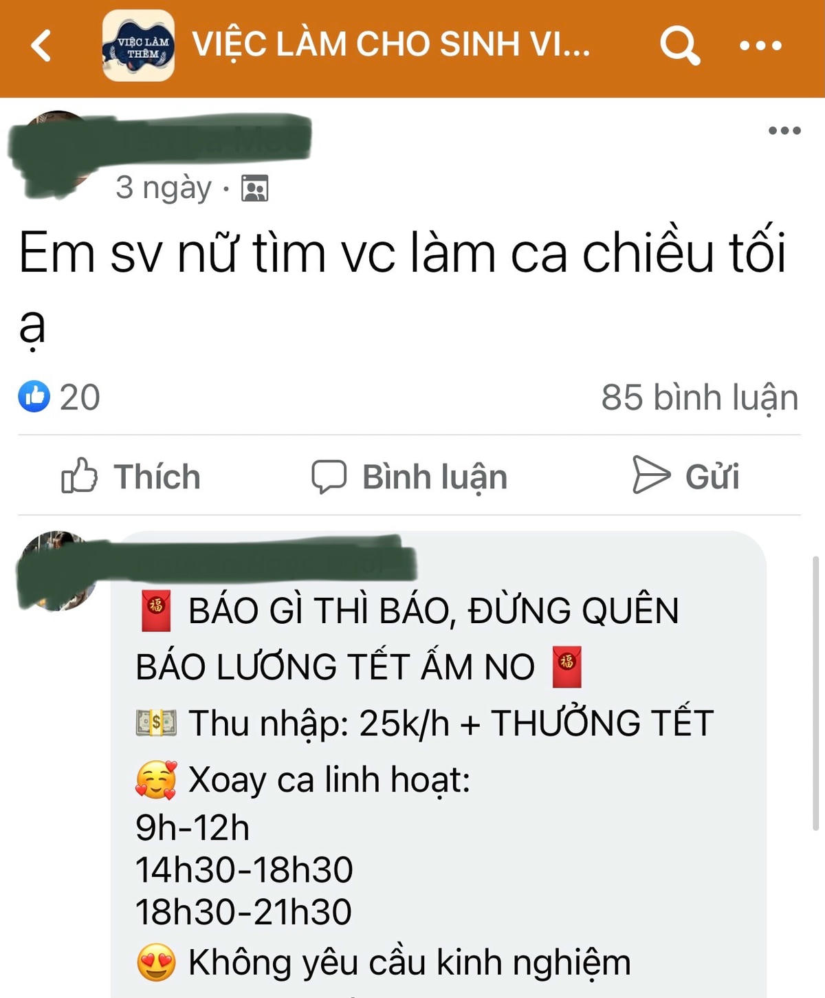 Sinh viên tìm kiếm việc làm cuối năm trên một nhóm mạng xã hội facebook.Trường Đại học Thương Mại cũng dự kiến nghỉ Tết Nguyên đán từ ngày 16/1/2023 đến ngày 28/1/2023. Như vậy, sinh viên của trường được nghỉ Tết 13 ngày.