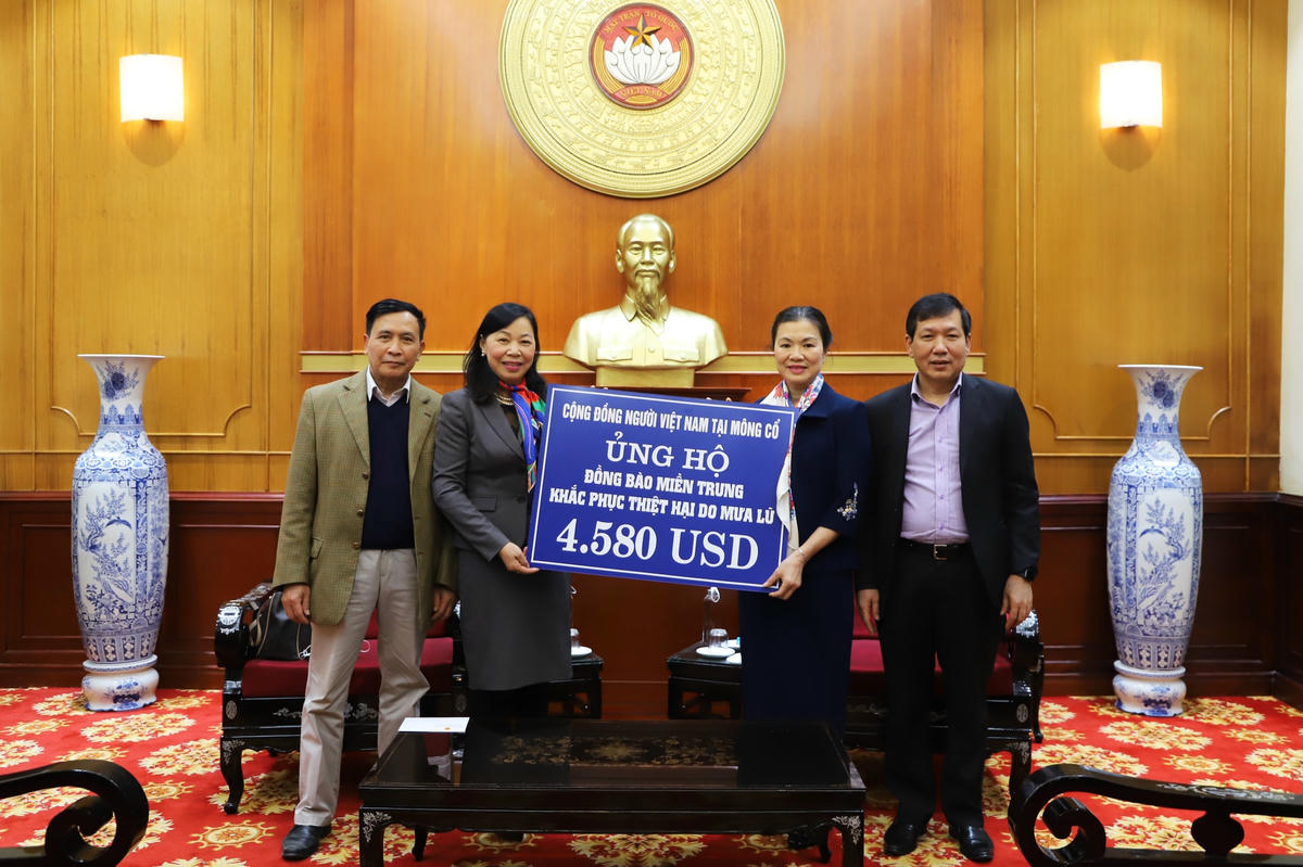 Ngày 3/2, bà Trương Thị Ngọc Ánh, Phó Chủ tịch UBTƯ MTTQ Việt Nam đã tiếp nhận ủng hộ đồng bào miền Trung khắc phục thiệt hại do thiên tai, mưa lũ gây ra từ cộng đồng người Việt Nam tại Mông Cổ số tiền 4.580 USD.