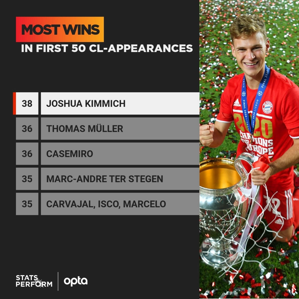 Joshua Kimmich là cầu thủ có số trận thắng nhiều nhất ở sân chơi Champions League tính trong 50 trận đấu đầu tiên.