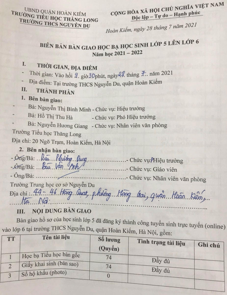 Nhà trường tổng hợp từ các lớp để ra được “bản đồ” học sinh trên 18 phường của Hoàn Kiếm và ngoài quận. Sau đó, hiệu trưởng trường tiểu học bàn giao hồ sơ học bạ cho hiệu trưởng trường THCS những học sinh trong tuyến, với sự đồng thuận của cha mẹ học sinh. Việc này được triển khai từ sớm, nên khi tuyển sinh trực tuyến, các nhà trường triển khai rất nhanh và hiệu quả” - bà Vương Hương Giang chia sẻ kinh nghiệm.