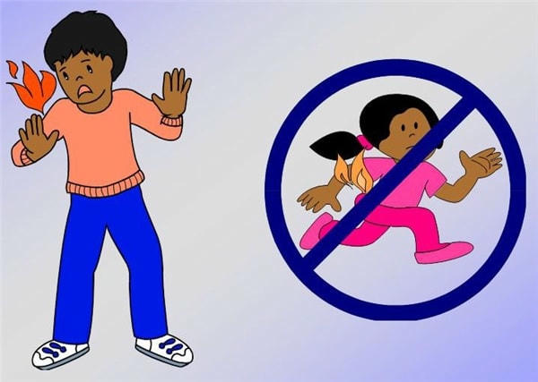 Kĩ năng 4: Trong trường hợp quần áo bị cháy, hãy dừng di chuyển, nằm xuống và trở mình liên tục cho đến khi ngọn lửa được dập tắt, đồng thời che mặt càng nhiều càng tốt. Không được chạy vì gió sẽ làm lửa cháy nhiều hơn. Không nhảy xuống bể bơi, hồ bơi hoặc bể nước vì nước có thể đã bị ngọn lửa làm nóng.