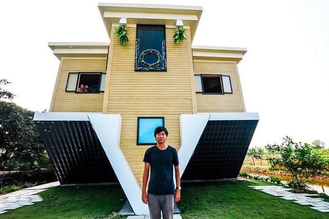 Tháng 6/2019, anh Trần Thanh Nguyên (Sa Đéc, Đồng Tháp) khởi công xây dựng ngôi nhà úp ngược với 2 tông màu vàng, đen là chủ đạo. Căn nhà có 5 phòng với phòng khách, phòng ăn, phòng ngủ, phòng cà phê và mini shop, tổng chi phí xây dựng là 800 triệu đồng.