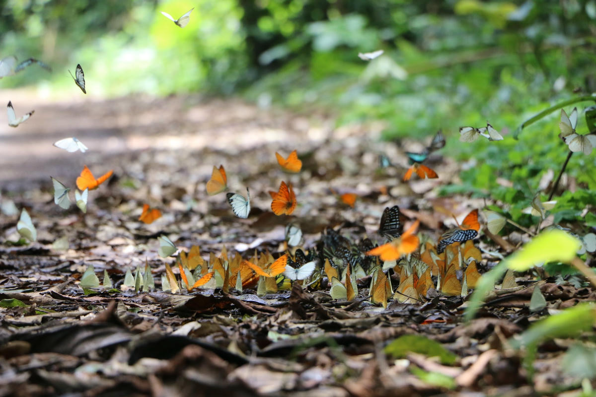 Ngay từ cổng vào, giữa thời tiết tháng tư chúng tôi đã đã bắt gặp từng đàn bướm với sắc màu sặc sỡ nối đuôi nhau. Nhiều nhất vẫn là loài bướm trắng, bướm phượng, bướm khế…Những đàn bướm bồng bềnh như đám mây trắng, hồng, cam,… khiêu vũ trong không gian. Không gian của rừng Cúc Phương vốn dĩ đã rất xanh mát, hiền hòa, giờ đây lại càng khiến con người ta mê đắm như lạc vào tiên cảnh.