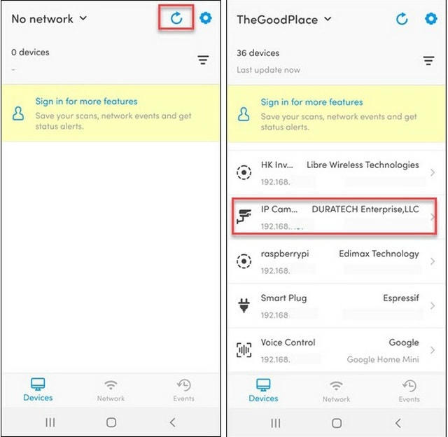 Để thực hiện điều này, người dùng có thể nhờ đến ứng dụng với tên gọi Fing. Đây là ứng dụng cho phép liệt kê đầy đủ các thiết bị đang kết nối vào mạng WiFi mà smartphone đang sử dụng. Dựa vào danh sách này, người dùng có thể biết được có camera nào đang kết nối mạng WiFi hay không và nhiều khả năng đó chính là camera quay lén.