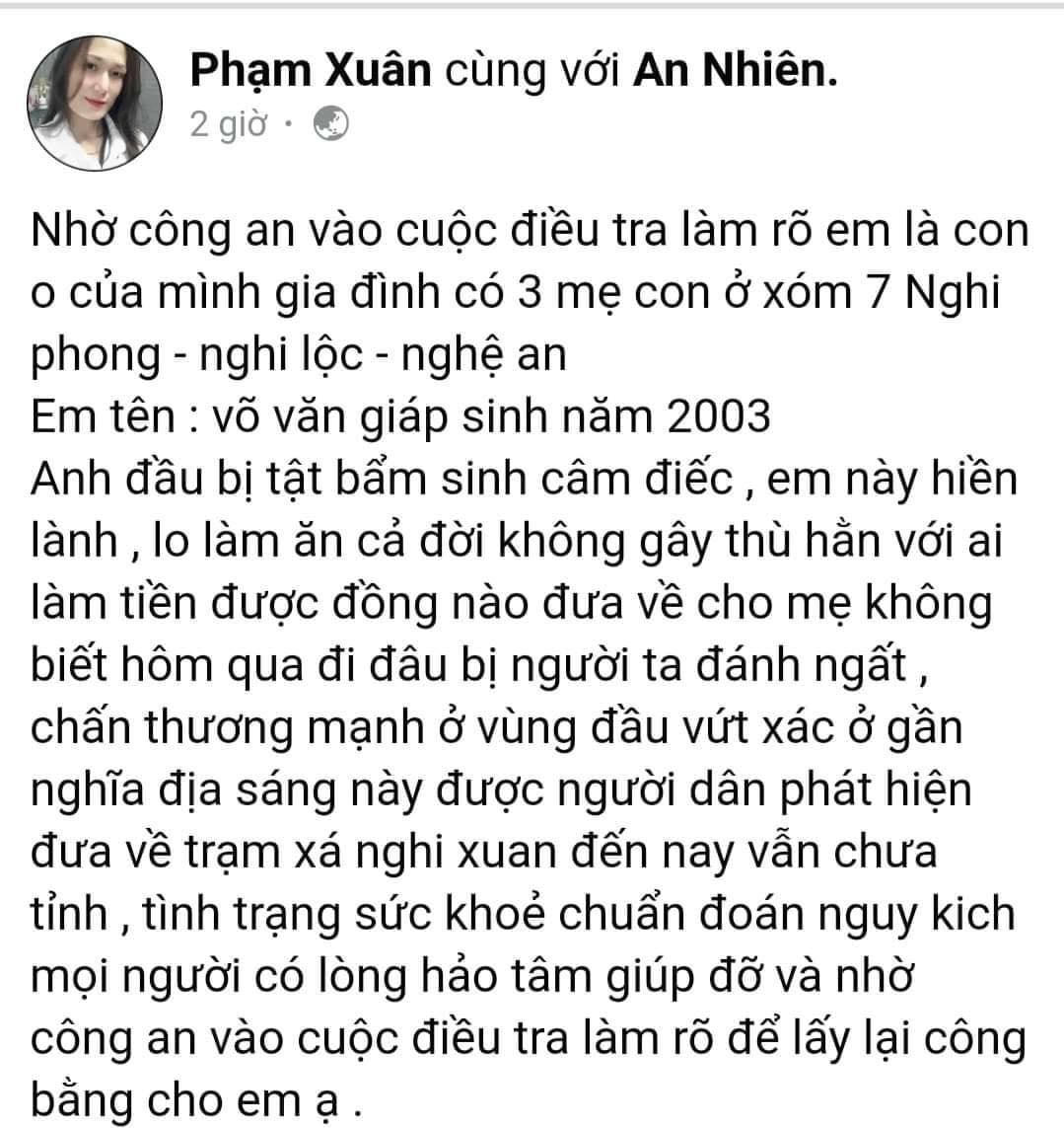 Theo ông Hà, qua xác minh được biết, nạn nhân là anh Võ Văn Giáp (18 tuổi), trú xóm 7, xã Nghi Phong. Gia đình nạn nhân Giáp có hoàn cảnh khó khăn, là hộ nghèo của xã. Giáp là con trai đầu, trong gia đình có 2 anh em. Bản thân nạn nhân Giáp bị khuyết tật, câm điếc bẩm sinh.