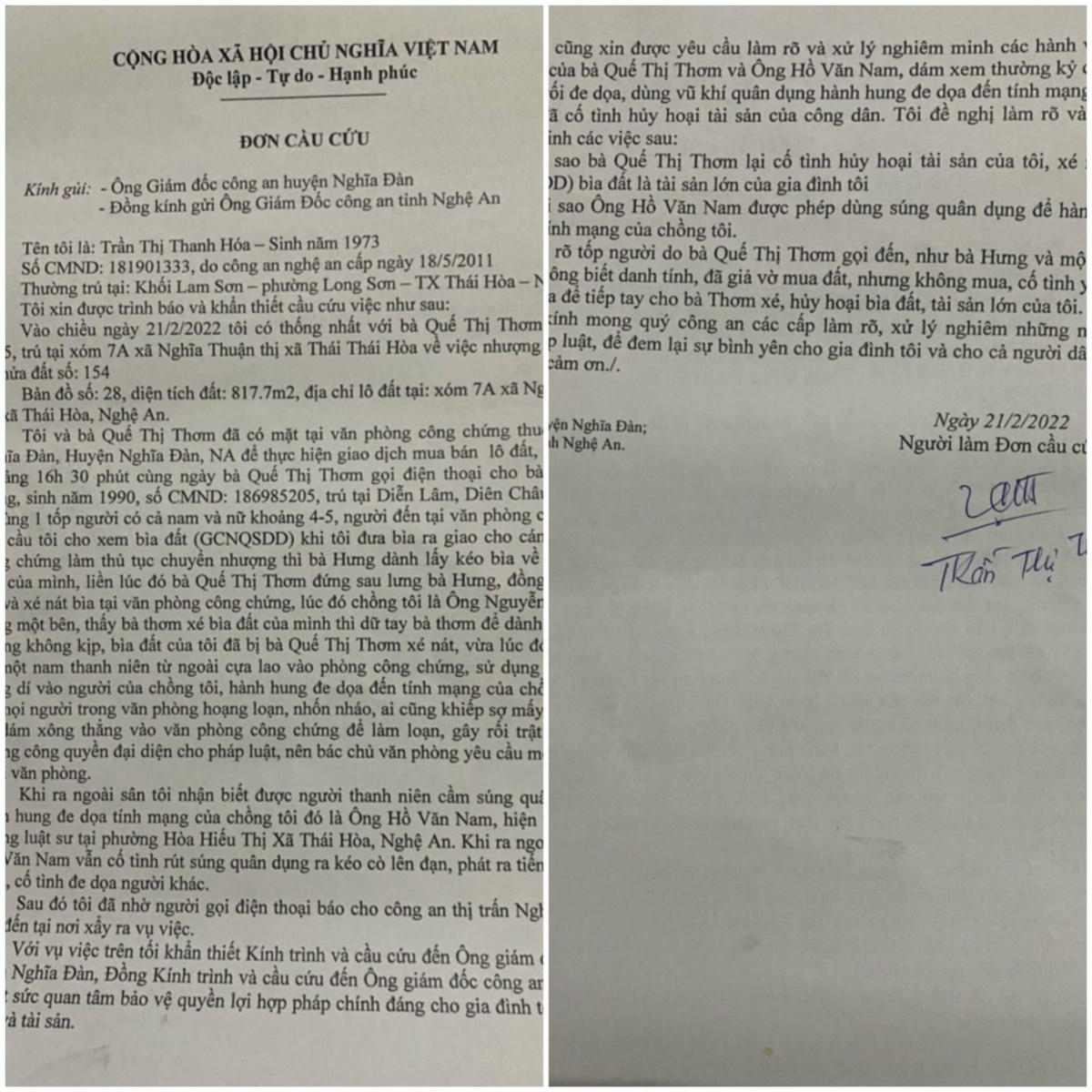 Trước đó, theo tố cáo của bà Trần Thị Thanh Hóa, trú tại thị xã Thái Hòa cho biết, vào khoảng 16h chiều ngày 21/2/2022 tại thị trấn Nghĩa Đàn, huyện Nghĩa Đàn, bà thống nhất với bà Quế Thị Thơm, trú tại xóm 7, xã Nghĩa Thuận, huyện Nghĩa Đàn trao đổi mua lại mảnh một mảnh đất với diện tích hơn 800 m2 mà bà Hóa đã mua trước đó của một người dân.