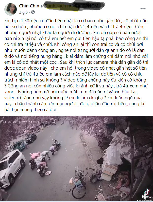 Tiền mồ hôi nước mắt, em đã năn nỉ và xin hậu tạ. Video rõ ràng như vậy không lẽ em không làm được gì ạ ? Em không ăn ngủ qua nay, đó giờ lần đầu rớt tiền, cũng là bài học mang theo cả đời".