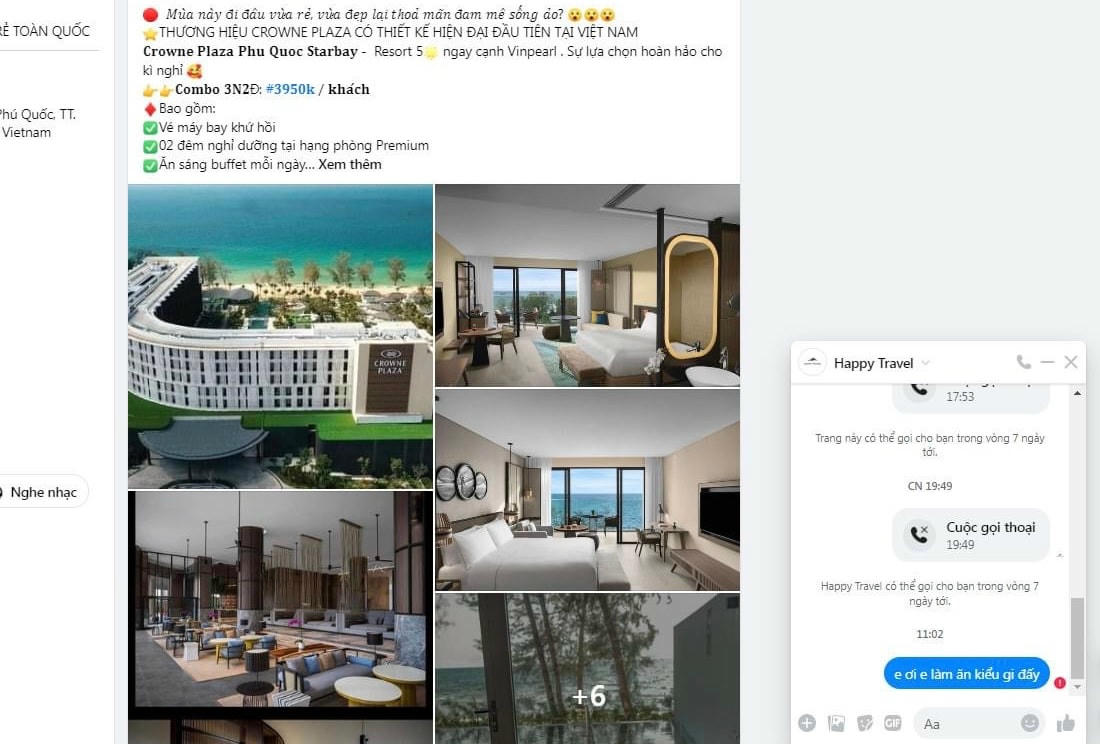 Từng là nạn nhân của chiêu trò này, chị N.M.T. (Hà Đông, Hà Nội) bức xúc: "Kỳ nghỉ lễ năm nay, tôi cùng gia đình có ý định đi du lịch tại Phú Quốc. Do chưa có kinh nghiệm nên tôi đã lên các hội nhóm Facebook để tham khảo. Sau một hồi tìm hiểu và so sánh giá thì thấy bài viết quảng cáo trên fanpage một công ty du lịch có bán combo này với giá rẻ nhất. Thế nhưng không ngờ mình lại bị lừa".