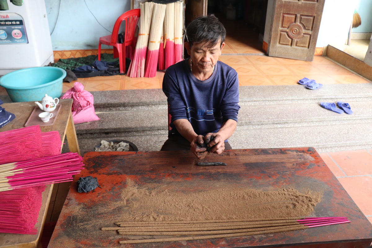 Tại nhà ông Mậu, hai vợ chồng ông cùng với 2 người làm vẫn đang miệt mài dùng bàn tay điêu luyện để tạo nên những que hương có mùi thơm êm dịu. Trong năm 2021, 4 người đã làm ra 700.000 que hương để xuất bán ra thị trường, 2 nhân công được ông Mậu trả lương khoảng 4 triệu đồng/người/tháng.