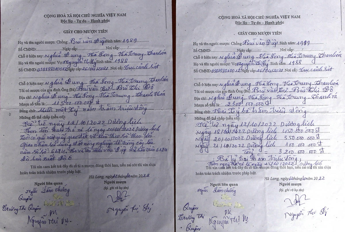 Tìm hiểu thêm, chúng tôi được biết: Không chỉ ở Hà Long mà nhiều người dân khác ở thị xã Bỉm Sơn (Thanh Hóa) cũng đã tin và đưa cho Nguyễn Thị Lý vay tiền với lãi suất tương tự. Ông Mai Đức T. trú tại phường Bắc Sơn đưa chúng tôi xem các giấy nợ viết tay và hóa đơn chuyển tiền qua tài khoản ngân hàng, tố Nguyễn Thị Lý đang vay của ông tổng số tiền lũy kế lên đến 5,9 tỷ đồng. “Đây là toàn bộ số tiền bán dứa, chăn nuôi lợn nhiều năm, rồi bán đất, huy động của con cháu. Tôi cho vay từ tháng 10/2021 là 400 triệu đồng, sau huy động cho vay tăng dần. Những tháng đầu, việc chuyển tiền đều qua tài khoản ngân hàng nên có hóa đơn giao dịch, gần đây vì tin tưởng nên thường chỉ chuyển qua tài khoản trên điện thoại" - ông T. bức xúc nói.