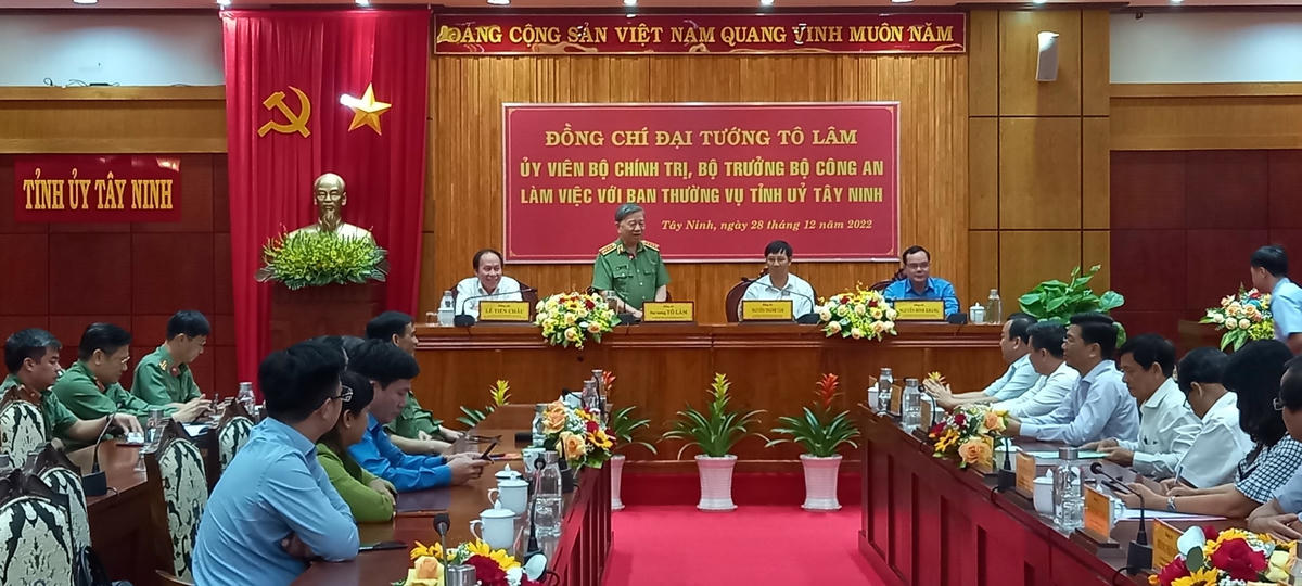 Chiều 28/12, Đại tướng Tô Lâm - Ủy viên Bộ Chính trị, Bộ trưởng Bộ Công an đã đến thăm, trao tặng quà Nguyên đán Tết Quý Mão 2023 cho người nghèo tại TP Tây Ninh (tỉnh Tây Ninh). Cùng đi có ông Lê Tiến Châu - Ủy viên Trung ương Đảng, Phó Chủ tịch – Tổng Thư ký Ủy ban Trung ương Mặt trận Tổ quốc Việt Nam; ông Nguyễn Đình Khang - Ủy viên Trung ương Đảng, Chủ tịch Tổng Liên đoàn Lao động Việt Nam.