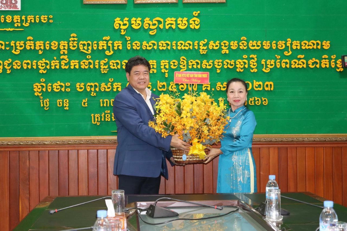 Bà Lê Thị Xuân Trang - UVBTV Tỉnh uỷ, Trưởng Ban Dân vận, Chủ tịch Uỷ ban MTTQ Việt Nam tỉnh Bình Phước thay mặt đoàn đã gửi lời chúc Tết cổ truyền Chôl Chnăm Thmây đến toàn thể lãnh đạo và nhân dân các tỉnh năm mới sức khỏe, hạnh phúc, an khang, thịnh vượng. Chủ tịch Uỷ ban MTTQ Việt Nam tỉnh Bình Phước chúc mừng những thành tựu mà các tỉnh Kratie, Mondulkiri, Tbong Kh’mum đã đạt được và xin chúc cuộc bầu cử sắp tới của tỉnh bạn thành công tốt đẹp.