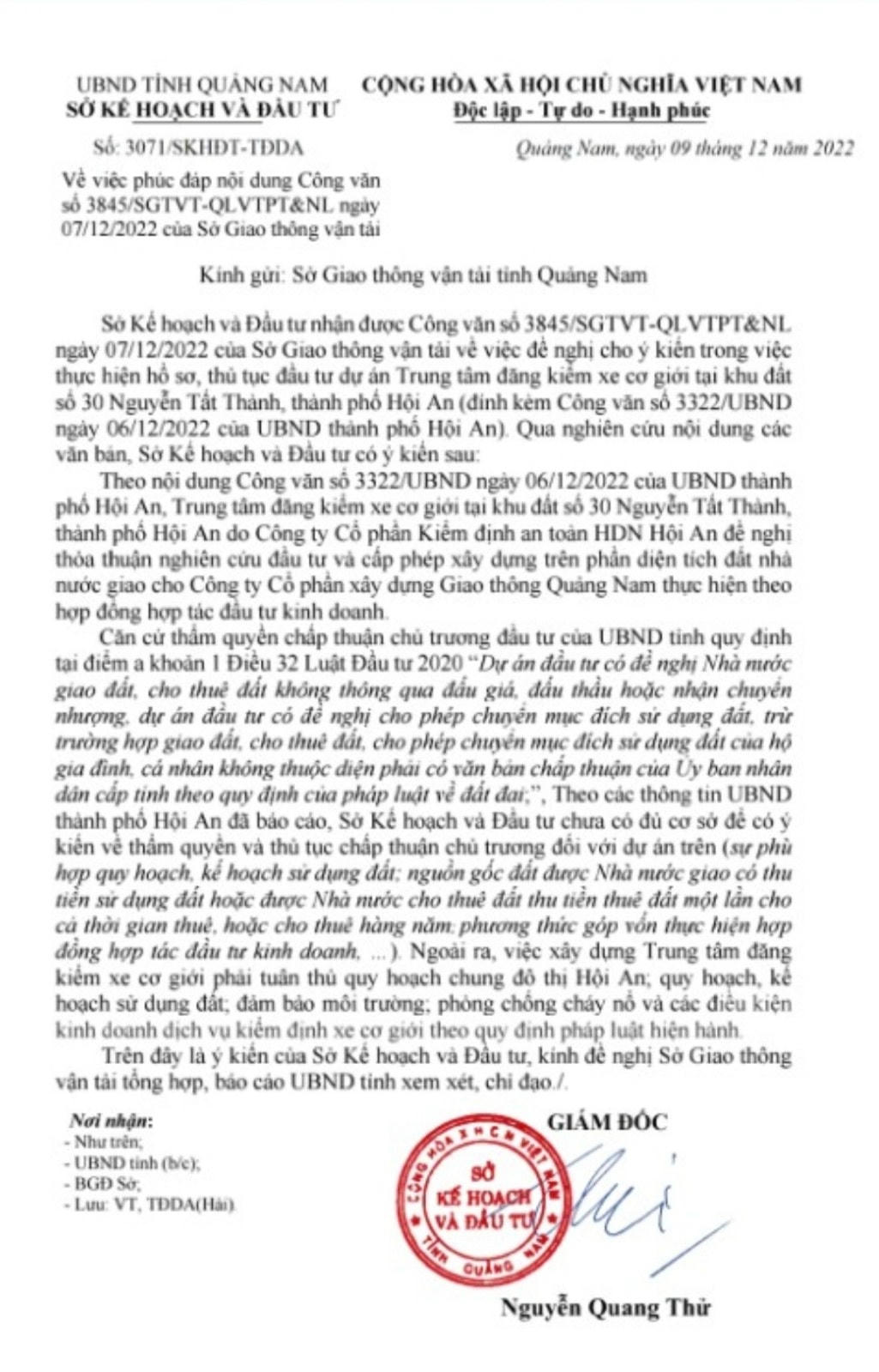 Tuy nhiên theo ông Thử, mới đây Sở KH-ĐT có nhận được Công văn số 3845/SGTVT- QLVTPT&NL ngày 7/12/2022 của Sở GTVT về việc đề nghị cho ý kiến trong việc thực hiện hồ sơ, thủ tục đầu tư dự án TTĐK xe cơ giới tại khu đất số 30 Nguyễn Tất Thành, TP Hội An (đính kèm Công văn số 3322/UBND ngày 6/12/2022 của UBND TP Hội An).