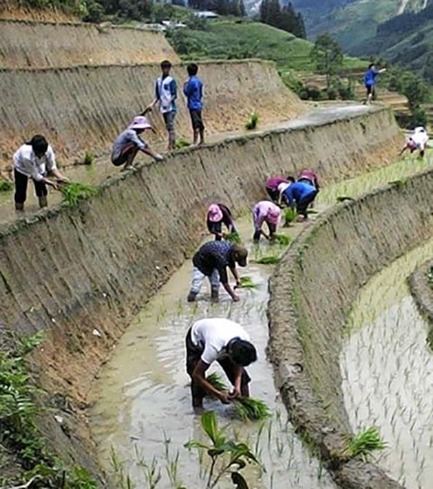 Cách thành phố Hà Giang hơn 50 km, theo con đường nhựa, rồi đường bê tông uốn lượn như một dải lụa dẫn chúng tôi lên “lưng chừng trời”, loáng thoáng trong làn sương sớm, hiện ra những thửa ruộng bậc thang hùng vĩ, màu xanh của cây trái, nương rau phủ kín núi đồi. Tiếng lốc cốc của mõ trâu vang rộn cả một vùng, những cánh đào sớm báo hiệu một mùa Xuân mới đang về.
