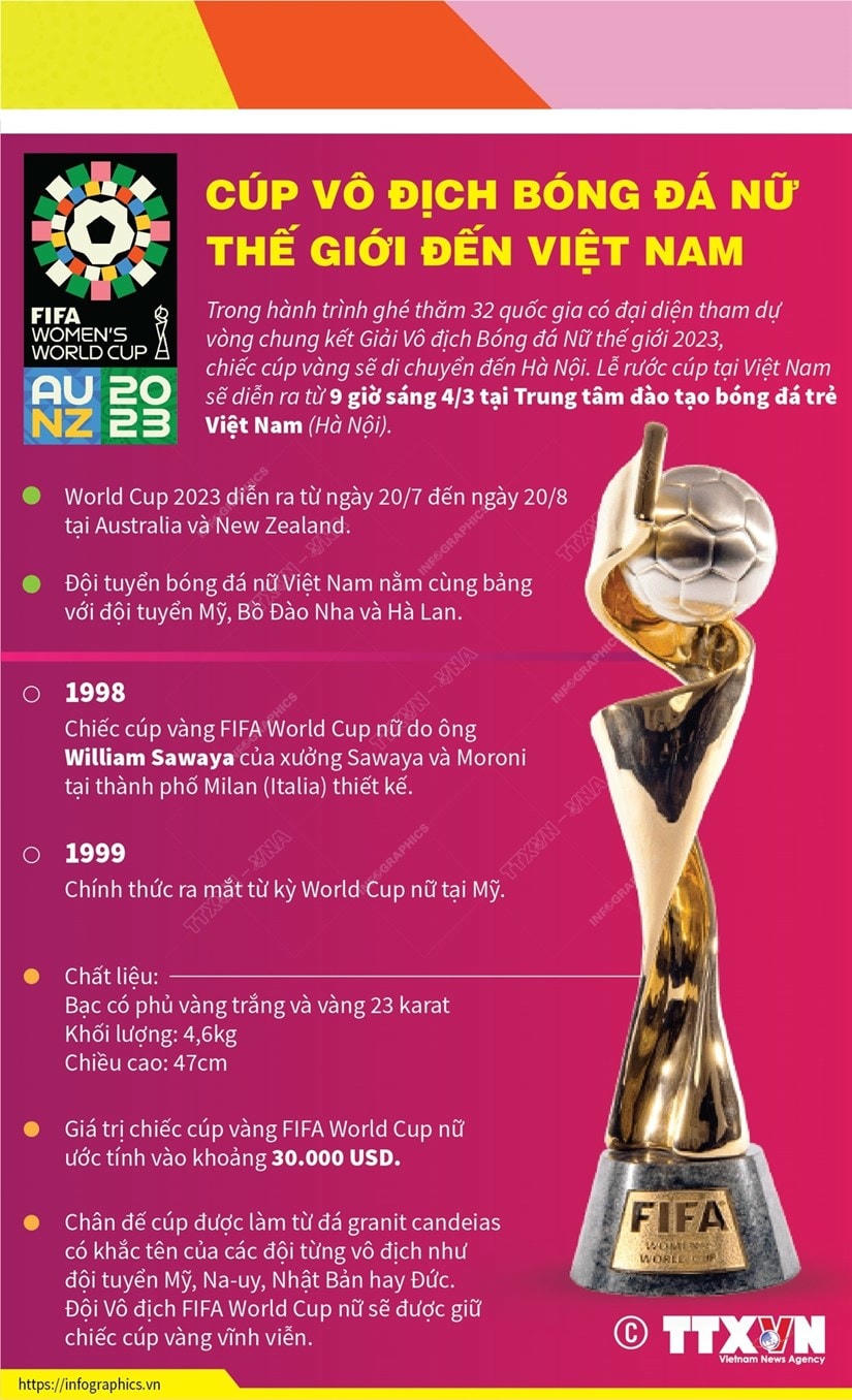 Theo TTXVN, trong hành trình ghé thăm 32 quốc gia có đại diện tham dự vòng chung kết Giải Vô địch Bóng đá Nữ thế giới 2023, chiếc cúp vàng sẽ di chuyển đến Hà Nội.