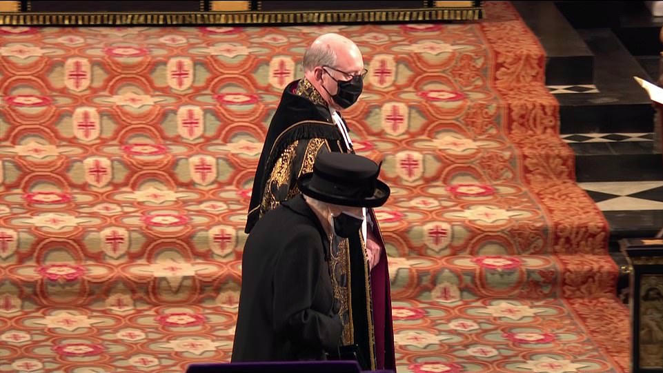 Nữ hoàng Elizabeth, mặc đồ đen và đeo khẩu trang đen viền trắng, đứng một mình khi lễ tang bắt đầu ở Nhà nguyện St George, có từ năm 1475.