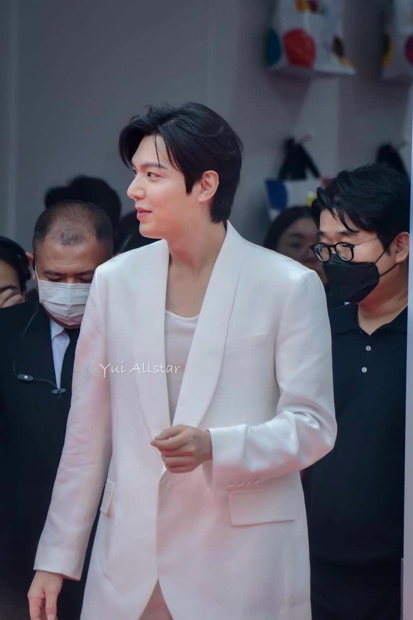 Lee Min Ho mặc bộ đồ vest trắng lịch lãm, bảnh bao và liên tục vẫy tay, tươi cười tương tác với khán giả tại sự kiện.