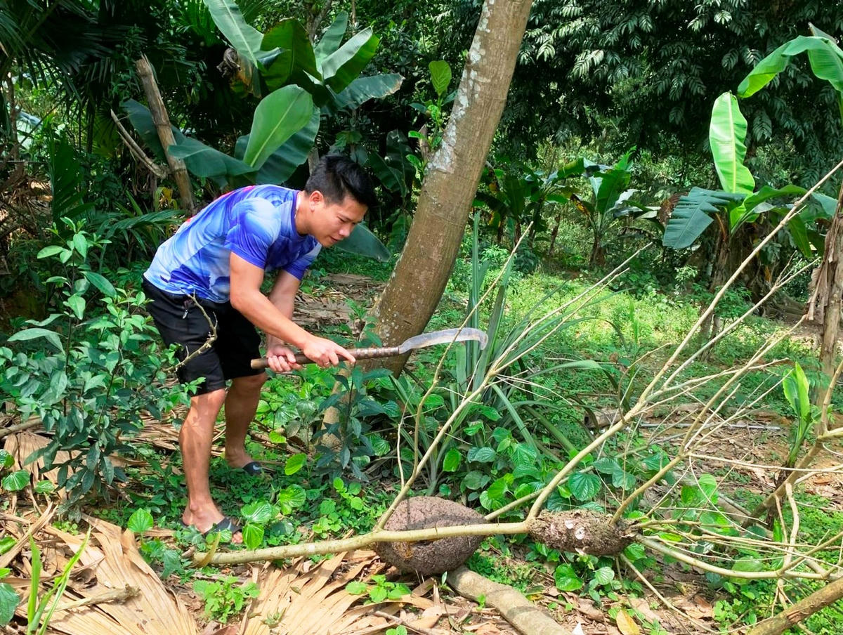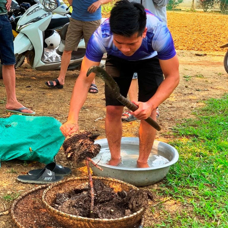 “Giơ tổ kiến lên rồi gõ gõ là trứng và cả kiến thợ rơi xuống mẹt tre như mưa. Để không bị kiến đốt, tôi thường mang theo một cái thau nước, rồi đứng trong thau có nước để ngăn kiến cắn vào chân” - anh Huy chia sẻ kinh nghiệm.