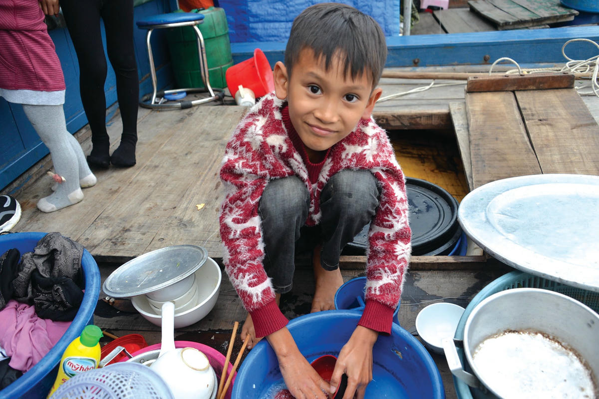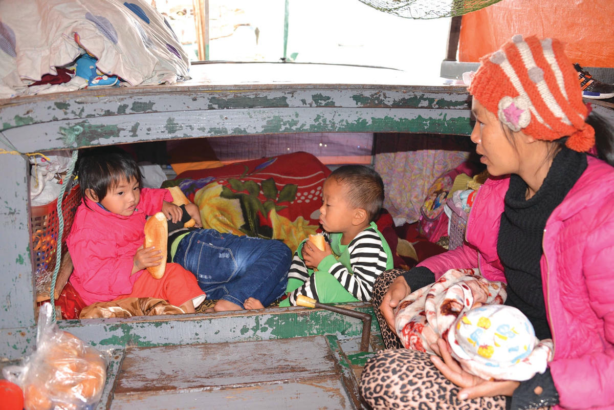 Mùa này, các gia đình bắt đầu quây bạt xung quanh thuyền để ngăn mùa đông gió rét. “Phòng” ngủ của một gia đình xóm chài là ván thuyền chật hẹp. Nhiều đứa trẻ ở những xóm chài dường như đã quá quen với cái lạnh nên chúng vẫn thoải mái chơi đùa. Khoảng không gian chật hẹp trên thuyền cũng chính là sân chơi của bọn trẻ. Khi bố mẹ rong ruổi trên những chiếc thuyền câu nhỏ, làm đủ các nghề đánh bắt hải sản mưu sinh, thì nhiệm vụ của trẻ lớn là trông em và phụ giúp việc cho gia đình.