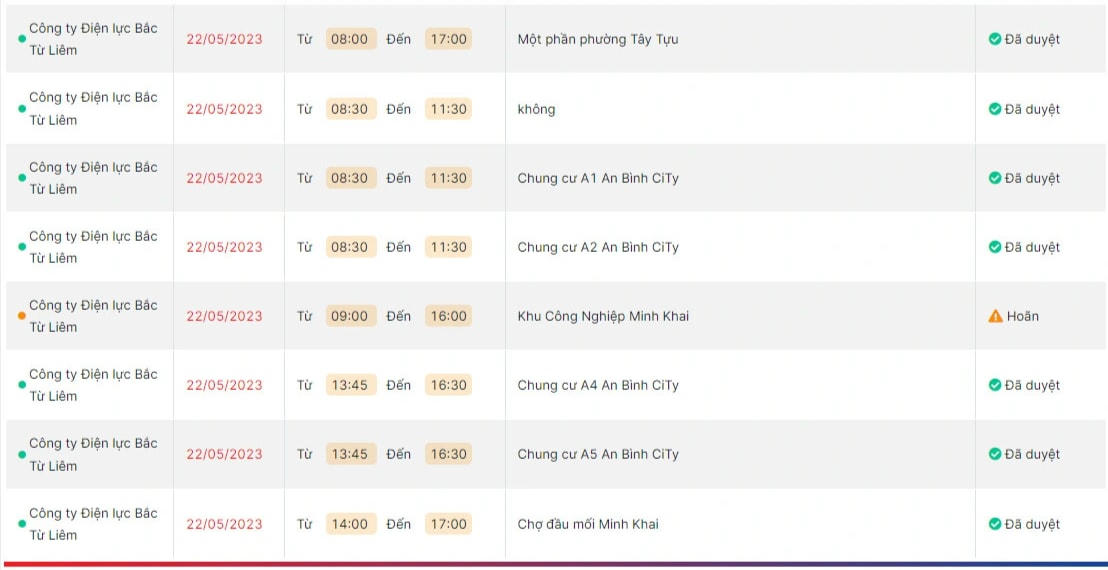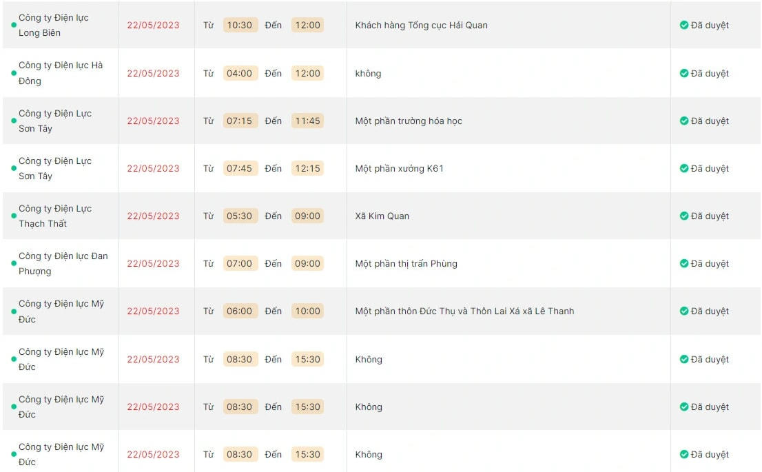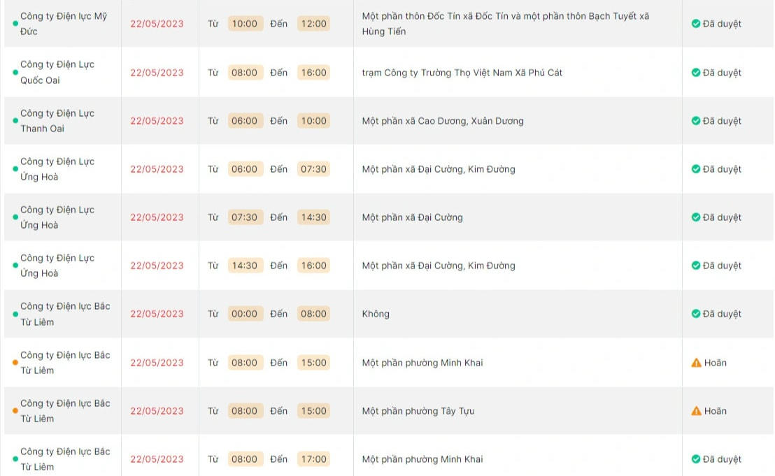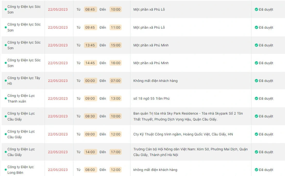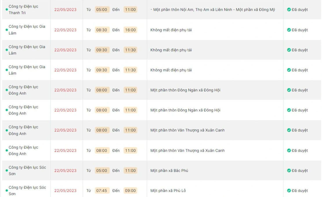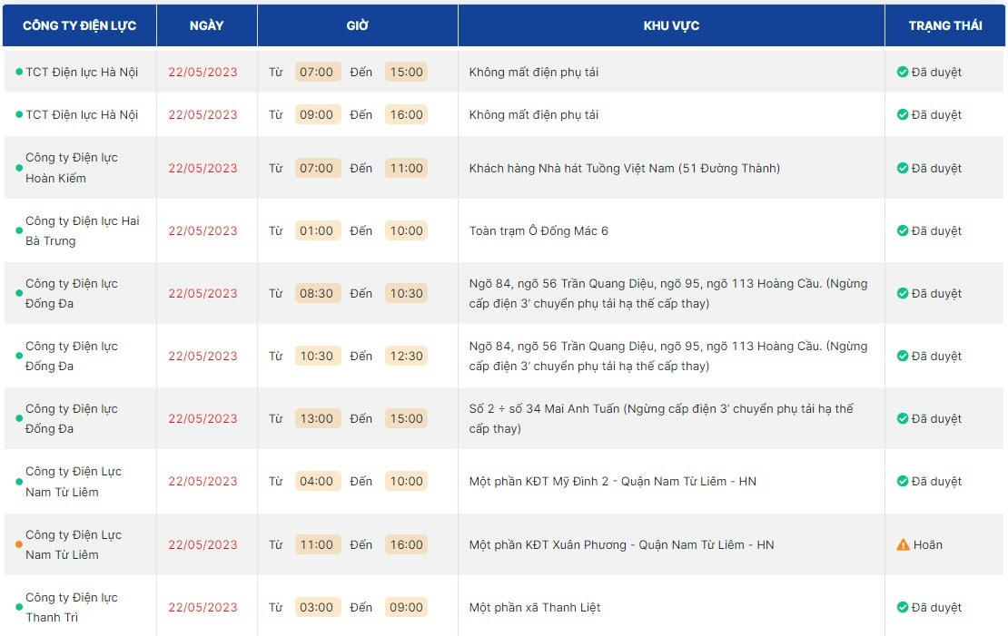 Dưới đây là lịch cắt điện tại Hà Nội ngày 22/5: